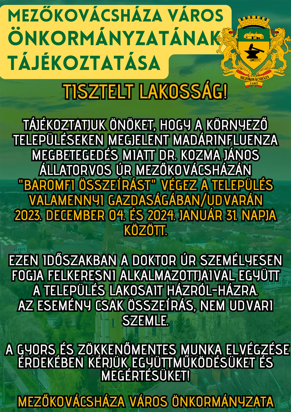 Mezőkovácsháza Község Önkormányzatának Képviselő-testülete 2023. nomveber 23-án (csütörtökön) 13 órai kezdettel közmeghallgatással egybekötött, soros, nyílt ülést tart, melyre ezúton meghívom.