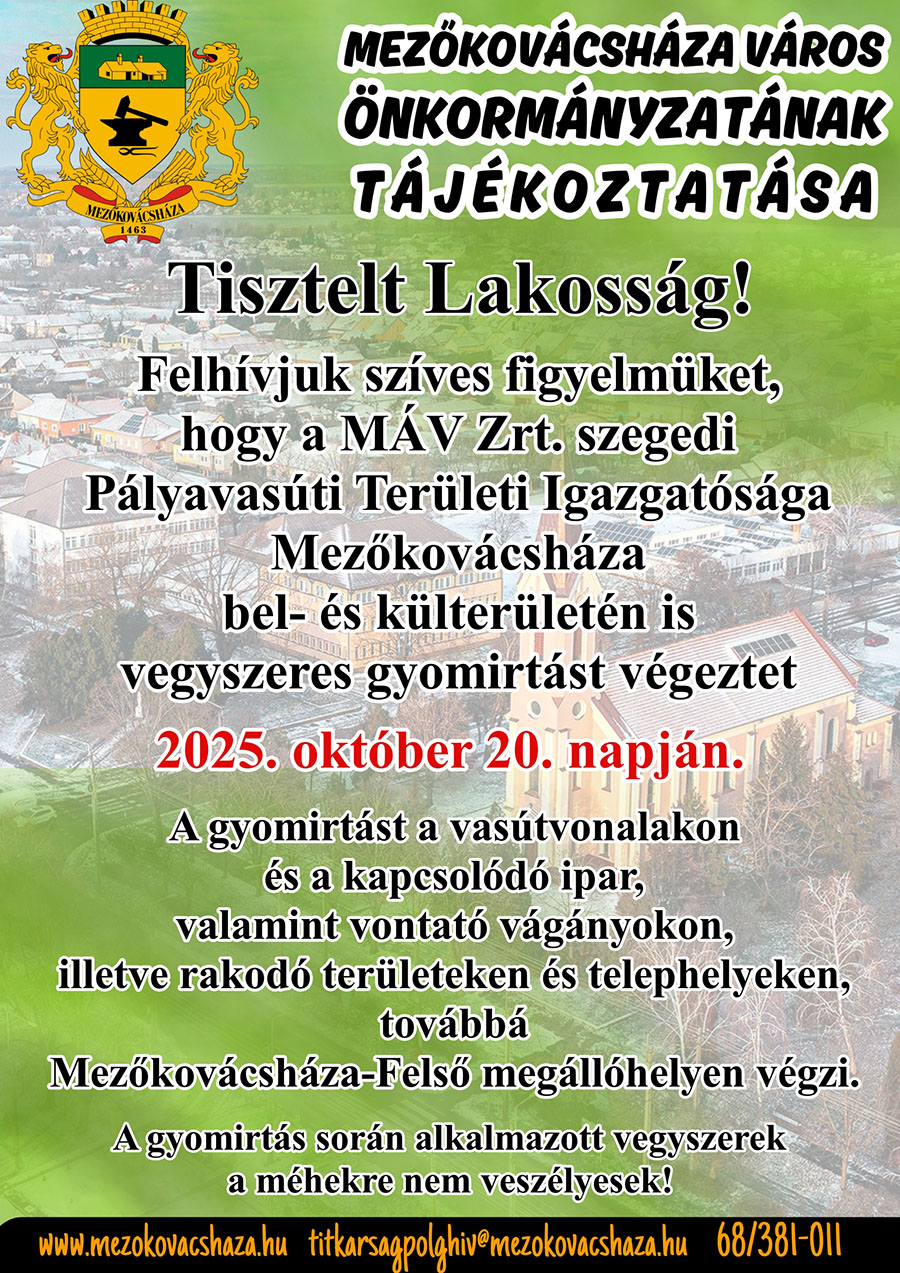 Mezőkovácsháza Város Önkormányzata ezúton értesíti a lakosságot, hogy a MÁV Zrt. szegedi Pályavasúti Területi Igazgatósága 2025. október 20-án vegyszeres gyomirtást végez Mezőkovácsháza bel- és külterületén.