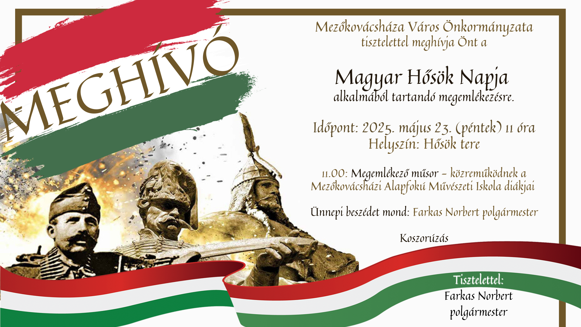 Mezőkovácsháza Város Önkormányzatának Képviselő-testülete 2025. április 30-án (szerda) 13:00 órai kezdettel soros, nyílt ülést tart, melyre ezúton meghívom.